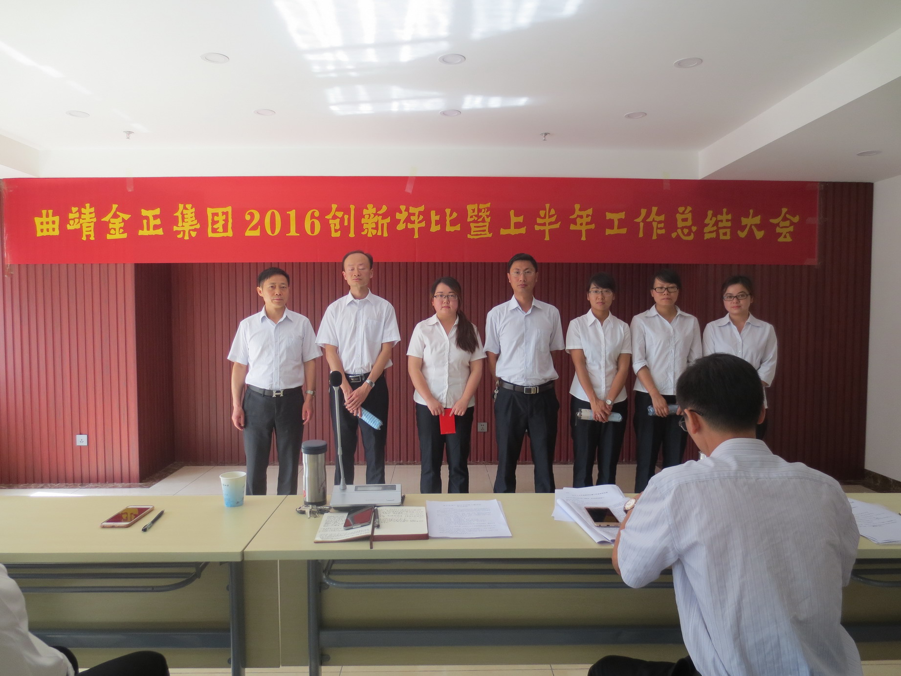 • 2016716,曲靖金正集團(tuán)2016上半年創(chuàng)新評(píng)比暨半年工作總結(jié)大會(huì)在公司會(huì)議室順利召開,公司領(lǐng)導(dǎo)及全體員工參會(huì)。在創(chuàng)新評(píng)選活動(dòng)中,參選人員做了精彩演講,分享創(chuàng)新活動(dòng)月的體驗(yàn)和成果。隨后,進(jìn)行了半年工作總結(jié),各部門積極分享工作中的寶貴經(jīng)驗(yàn),對做得不足的方面也進(jìn)行了總結(jié)分析,并明確了公司下半年的工作重點(diǎn)和方向。公司全員要嚴(yán)格要求自己,積極遵守工作紀(jì)律,加強(qiáng)責(zé)任心,在以往的成績上,弘揚(yáng)企業(yè)精神,創(chuàng)新工作思路,提升業(yè)務(wù)技能,使下半年的工作再上新臺(tái)階。