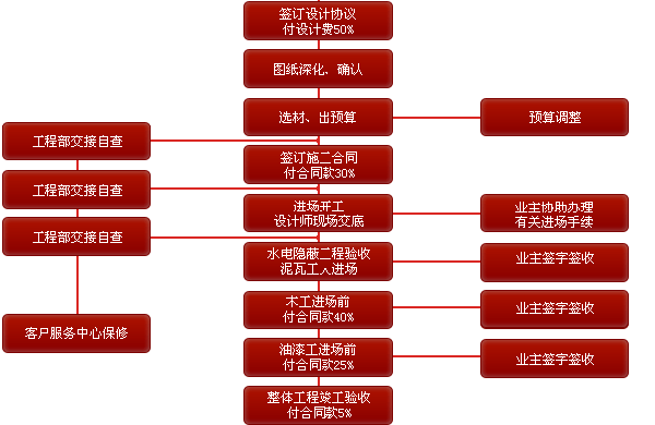 1.前期設(shè)計(jì) -- 2.主體拆改 -- 3.水電改造 -- 4.木工 -- 5.貼磚 -- 6.刷墻面漆 -- 7.熱水器安裝 -- 8.廚衛(wèi)吊頂 -- 9.櫥柜安裝-- 10.煙機(jī)灶安裝 -- 11.木門安裝 -- 12.地板安裝 -- 13.鋪貼壁紙 -- 14. 開關(guān)插座安裝 -- 15.燈具安裝 -- 16.五金潔具安裝 -- 17.窗簾桿安裝 -- 18.拓荒保潔 -- 19.家具進(jìn)場(chǎng) -- 20.家電安裝 -- 21.家居配飾
